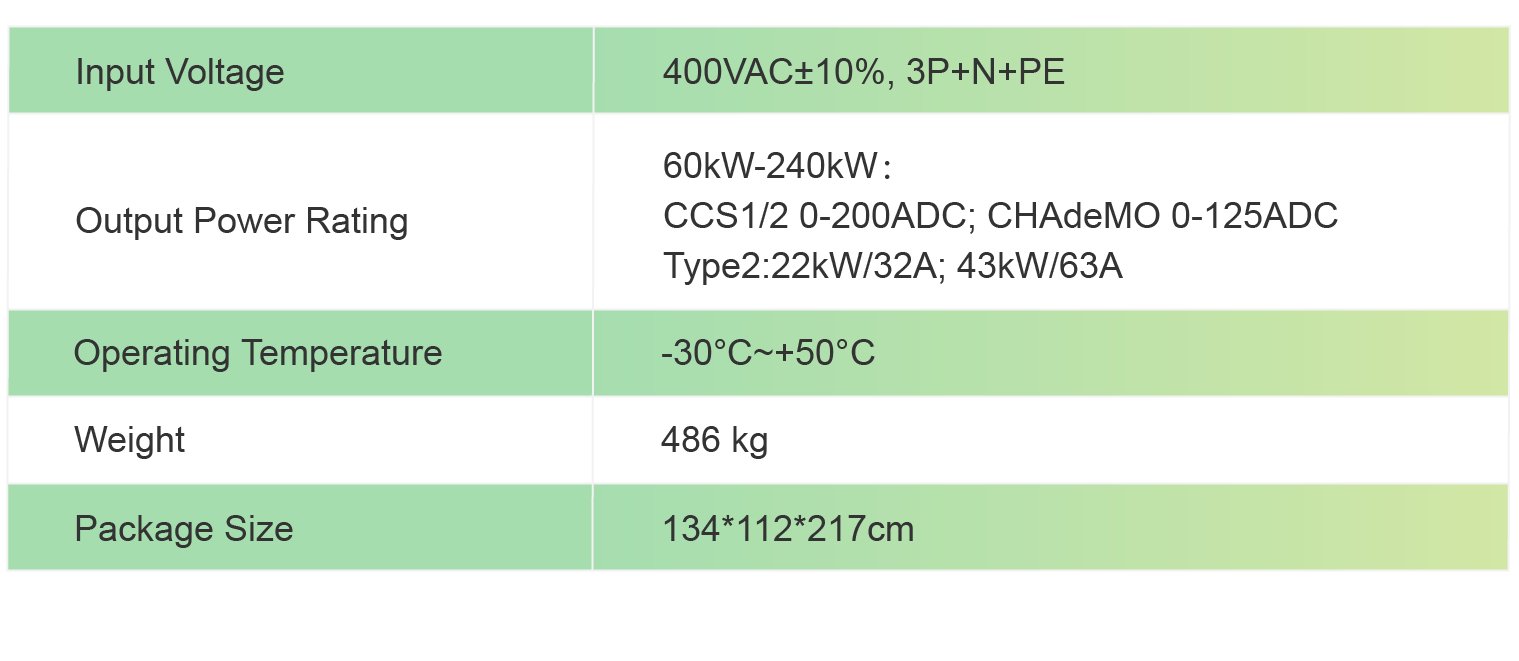 DC Fast DC electric vehicle charger has modern appearance design and user - friendly operation interface. It adopts modular design, easy to operate and maintain. Rich functions, support intelligent multi-charge, dynamic power distribution. The whole machine adopts dustproof and waterproof design, the protection level reaches IP54, not afraid of high and low temperature. Suitable for commercial square, charging station, office building, other scenes.